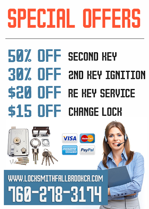 At { Locksmith Fallbrook CA }, you can have all the locksmith help you dearly need in minutes right where you are anywhere in the city. With our 24-Hour operated and running mobile locksmith service we serve any of your residential, commercial, and automobile bolt and key needs every day and night. If you happen to be locked out of your home doors, or maybe locked yourself out of your car in Fallbrook, California we are ready to answer your call and set you up with the nearest trained locksmith tech to you who will arrive shortly with all the right tools and equipment to properly unlock all of your vehicle doors and trunks. We are rated as one of the most trusted and [fastest locksmithing companies in the city] and have some great deals and specials you will not want to miss out on. You can give us a call anytime you would like even if it is super late or early in the night or day and we will surely answer and provide you with as many free estimates as quotes as you want over the phone and have any additional questions answered right away.